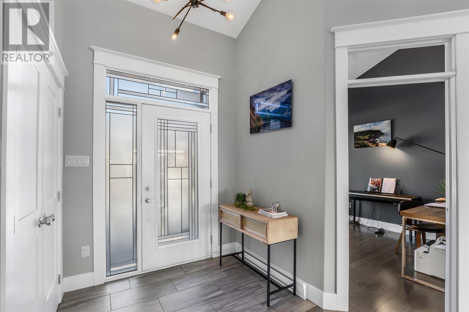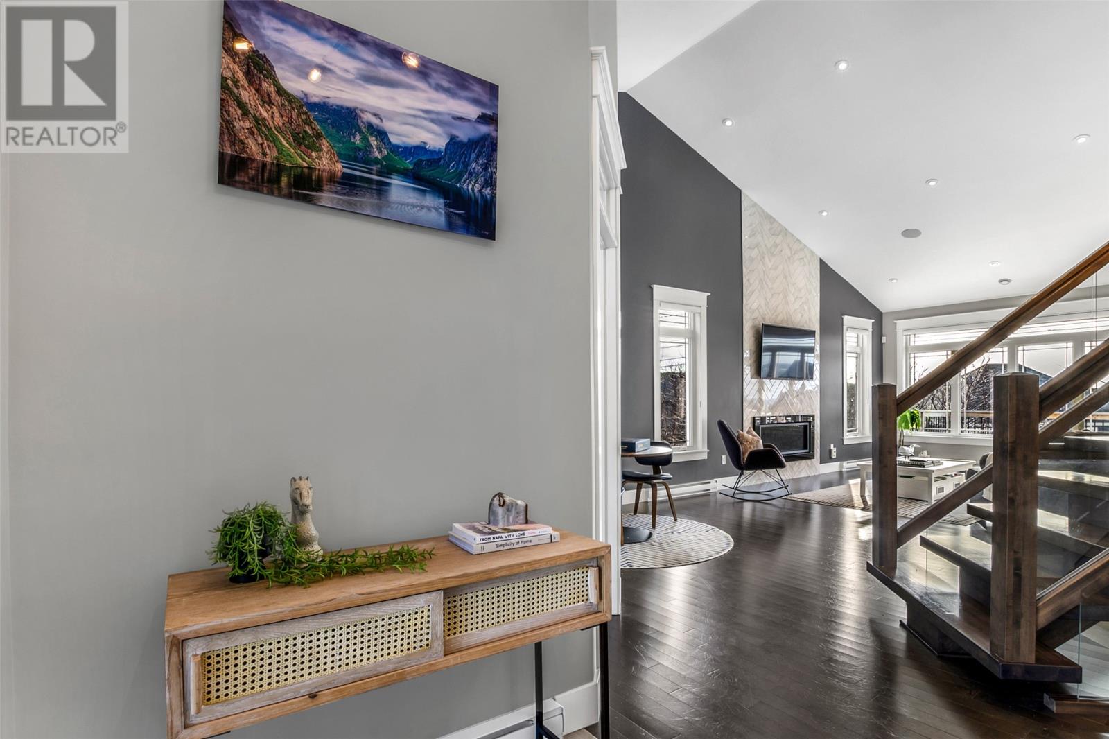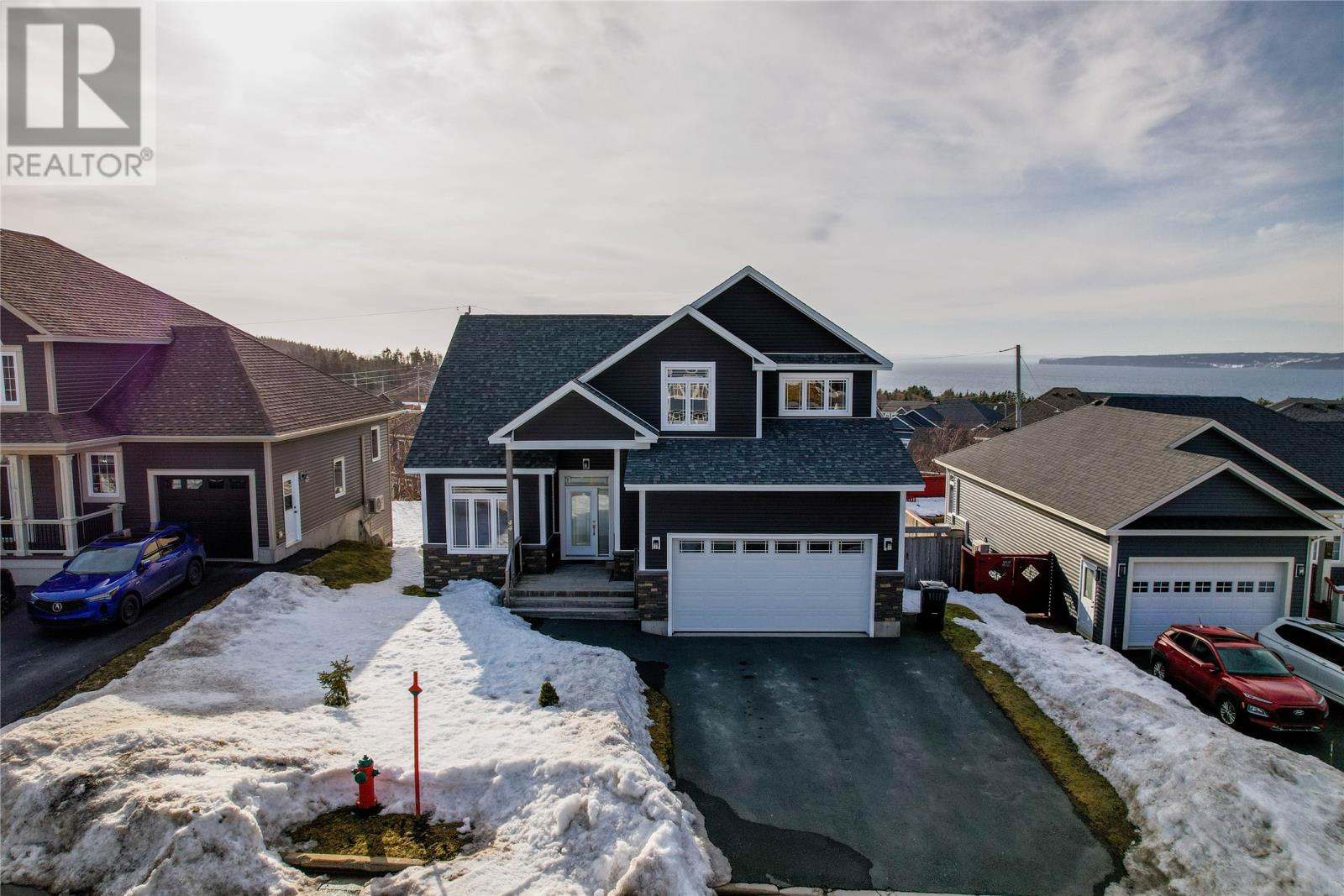 Absolutely stunning custom-built two-storey home with a two-car attached garage, located in Island View Estates and offering panoramic ocean views of Bell Island and Conception Bay. The bright main floor features vaulted ceilings and expansive windows that fill the space with an abundance of natural light. Designed with an open-concept layout, the main level includes a spacious living room with an elegant propane fireplace, a dining area, and a gourmet chef’s kitchen featuring ceiling-height cabinetry, quartz countertops, stainless steel appliances, a stylish backsplash, and a large island with access to the rear patio. A cozy den (currently used as a home office), powder room, and convenient laundry room with a custom tiled dog bath complete the main floor. An exquisite custom-built staircase leads to the upper level, which houses three spacious bedrooms and a main four-piece bathroom. The oversized primary retreat features a walk-in closet, a spa-inspired four-piece ensuite with double vanity and glass shower, and a private balcony to take in the incredible views. The fully developed, bright walk-out basement features large windows and includes a recreation room, sauna, fourth bedroom (currently used as a home gym), bonus room (currently used for storage), a four-piece bathroom, and ample storage space. This immaculate home is complete with two mini-split systems for efficient heating and cooling, heated flooring in the bathrooms, and custom-made Hunter Douglas window coverings throughout. Sure to impress! No conveyence of offers until Monday, March 23 @ 4:00pm and left open for acceptance unitl 9:00pm the same day (id:65620)
